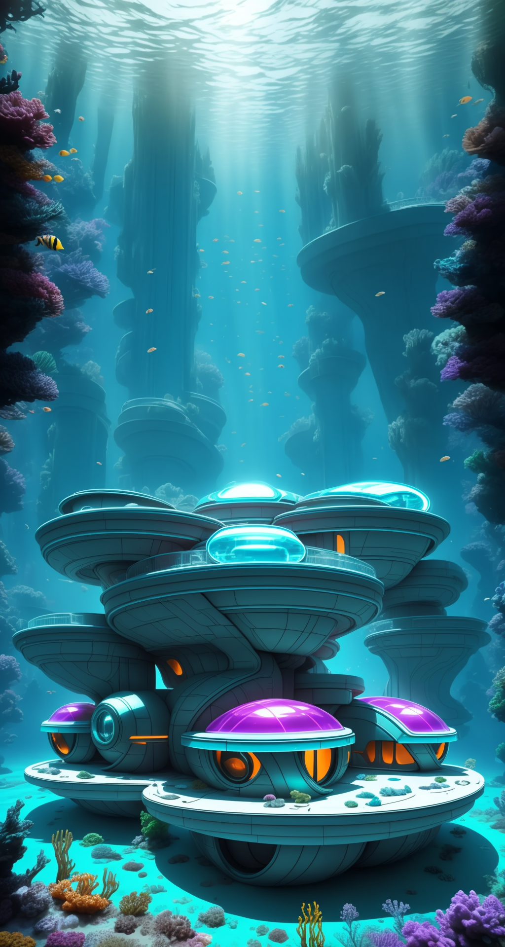 underwater BREAK underwater metal sci-fi 60s style house with oval forms <lora:Tesseract_2.0:1>, vivid colors,