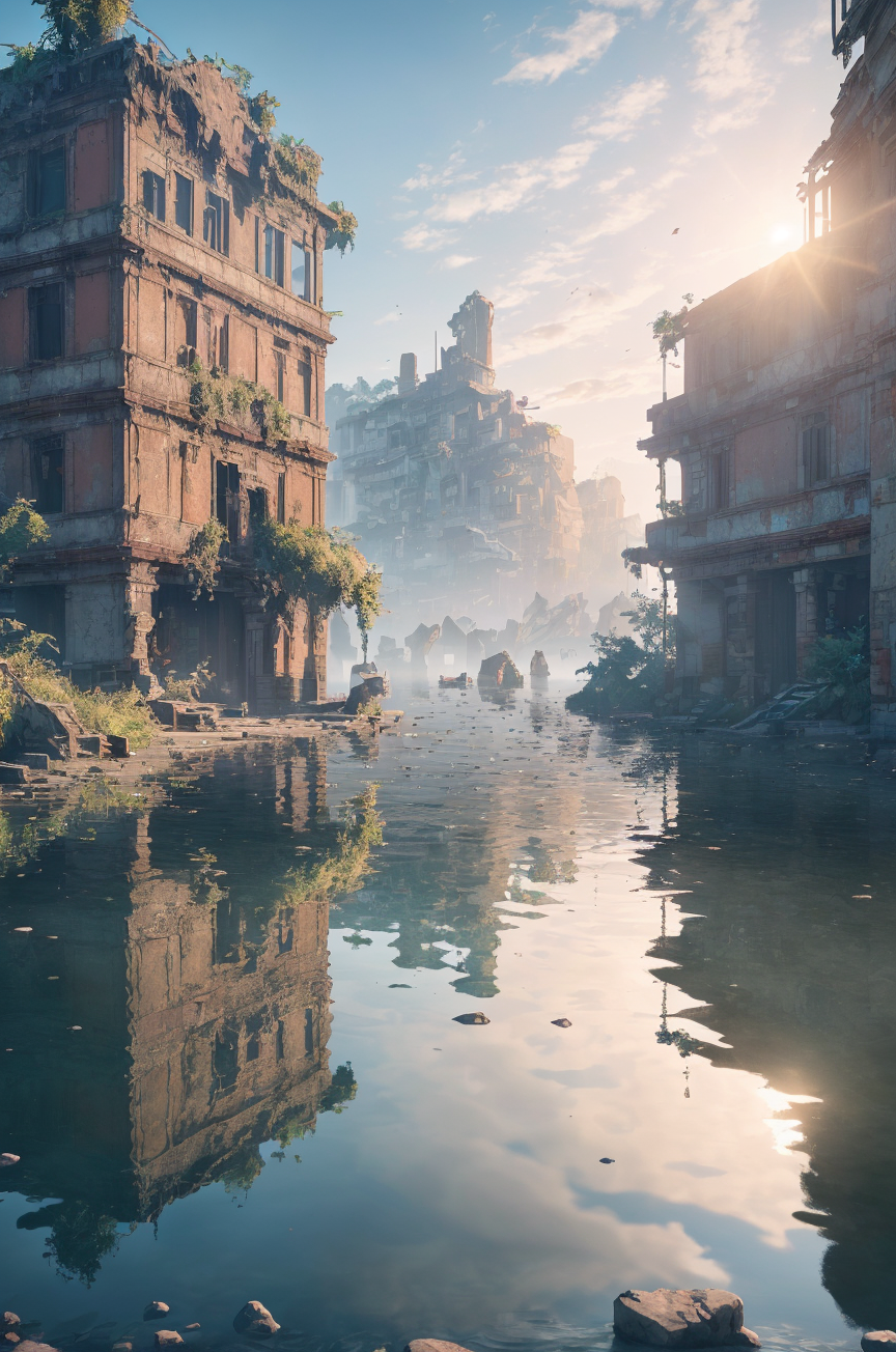 (8k, RAW photo, best quality, masterpiece:1.2), (realistic, photo-realistic:1.37), octane render, ultra high res, ultra-detailed , professional lighting, photon mapping, radiosity, physically-based rendering, ue5, ((island sanctuary)), ((ancient fallen kingdom)), ((reflections in water)), ((raytracing)), ((drowned city))