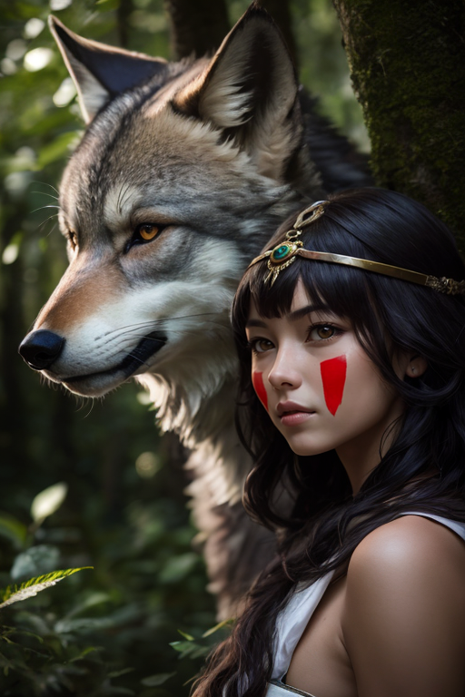 1girl, portrait of mononoke girl in forest with a giant grey wolve, paint red triagle on cheeks, dim light, <lora:ARWprincessmononoke:1>