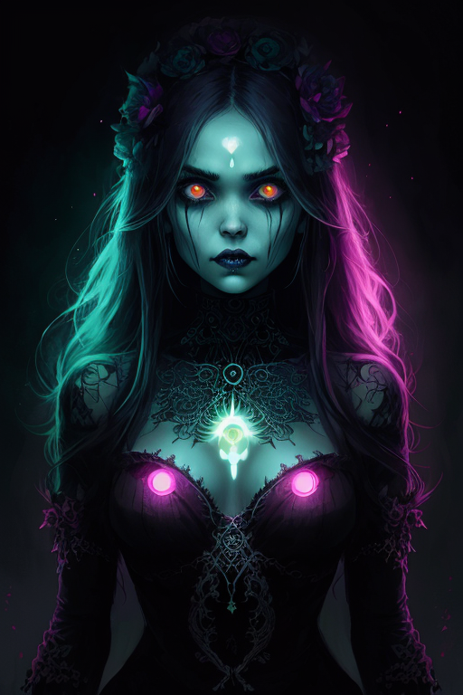 Slim Zombie girl, cute, Glowing eyes, dark themed, elegant, Intricate, Digital art, professional digital art made by mandy jurgens and anna dittmann, dark studio, studio lighting, horror:1.25, ((glowing gue of rainbow colors)),