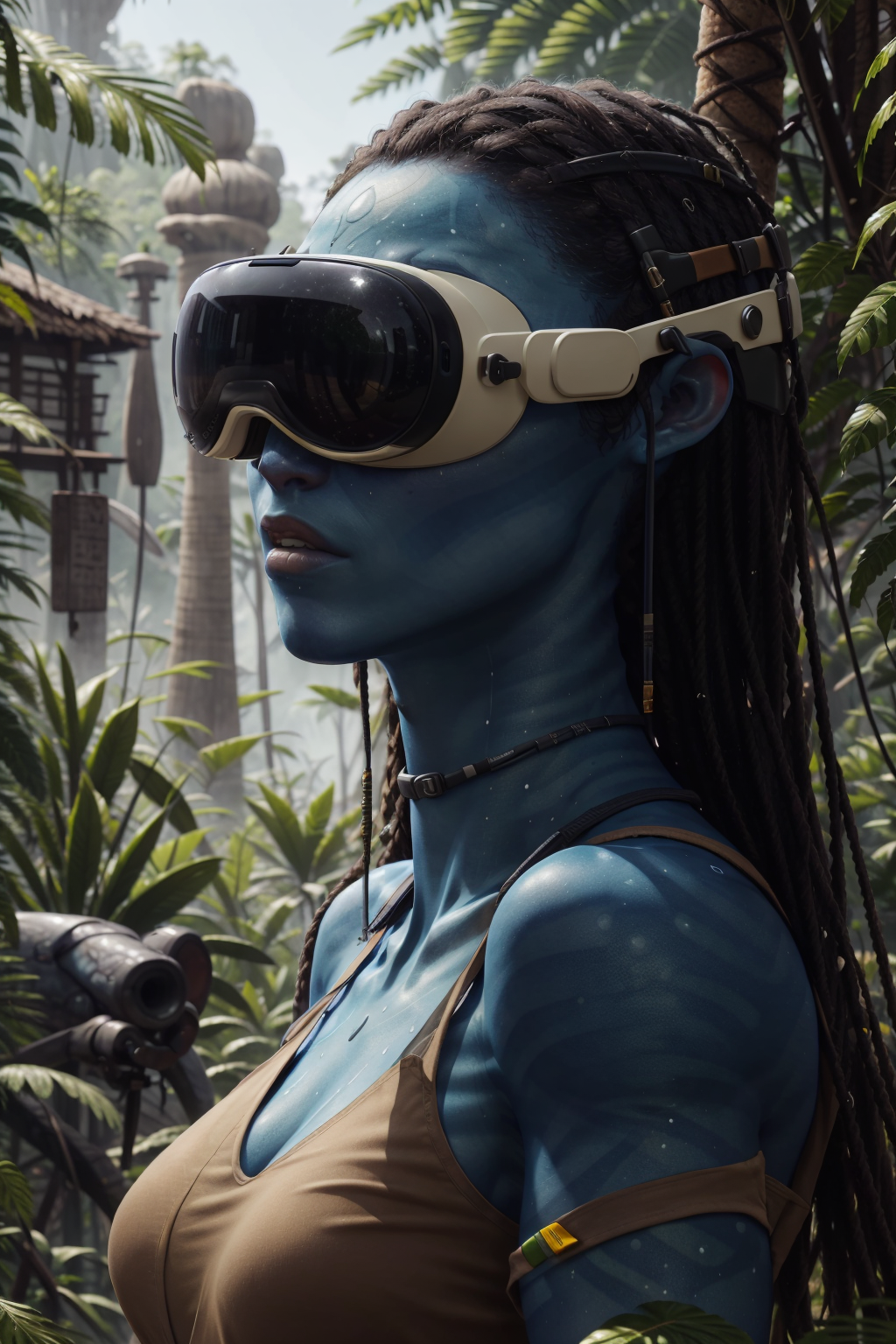 (Masterpiece, highres), AOA, Avatar Lara Croft, 1girl, Na'vi , blue skin, 8k, outback, tropical temple, jungle, toned, trees in the background, sweat, depth of field, saturated, clean, detailed, hyperdetailed, Intricate, blue skin, sunglasses, detailed skin, skin pores, ultra quality, Film grain, <lora:vision_pro_v1:0.3>,<lora:AllOutNa'vi_V1:0.6>wearing VR glasses, wearing Vision Pro