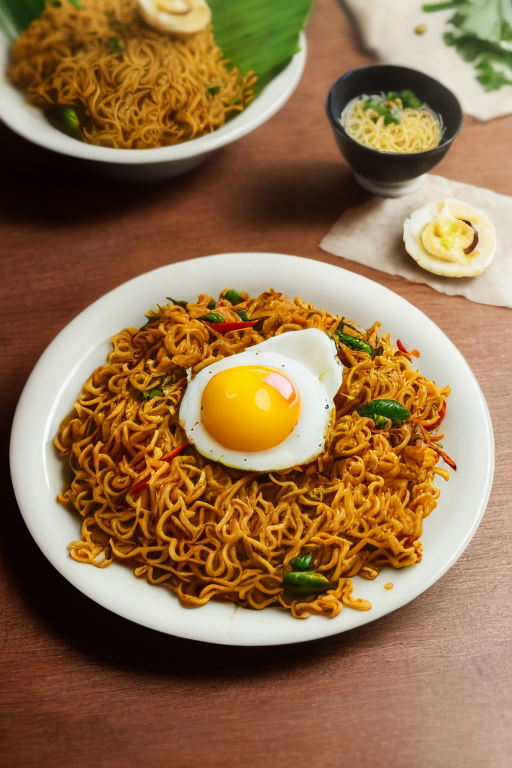 food, photography, miegoreng with egg fried and chilies on banana leaf, wooden table, soft focus, dramatic light, low ligt, blurry background <lora:ARWmiegoreng:1>