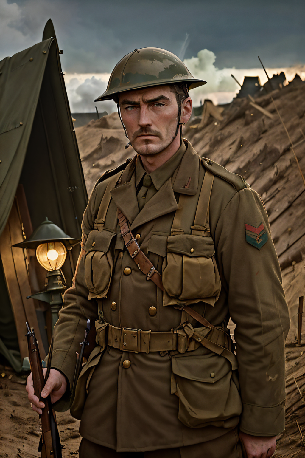 closeup photograph of PhilipCipher, world war one british officer <lora:ww1brit_v0.1:0.65>, battlefield, no man's land, painting, world war one, ww1, battle, Verdun, Ypres, William Barnes-Wollen, John Singer Sargent, CRW Nevinson, war photography, Ernest Brooks, cinematic lighting, atmospheric, 35mm, depth of field