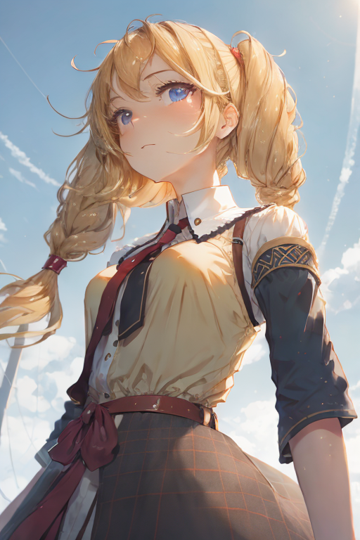 from below,1girl,blonde hair, twintails,upper body, masterpiece,best_quality, simple background, <lora:DIno-000008:1>
