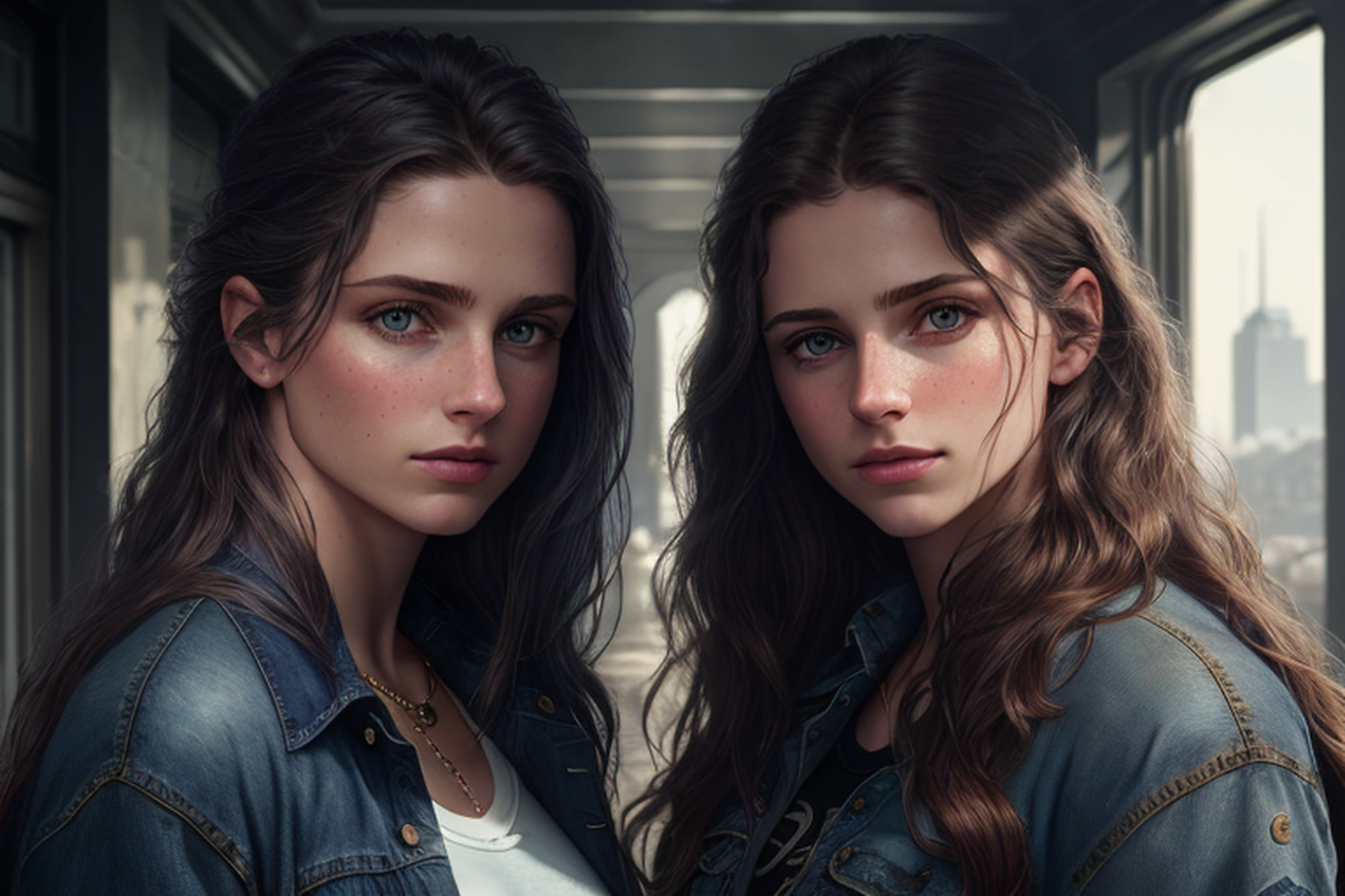 RAW photo of Muirgheal MacCarrick, 2 girls with shirt, blue jeans, long hair, Photorealistic, Hyperrealistic, Hyperdetailed, low cut, detailed skin, soft lighting, subsurface scattering, realistic, heavy shadow, masterpiece, best quality, ultra realistic, 8k, golden ratio, Intricate, High Detail, film photography, soft focus ,(cybercity:1.2)