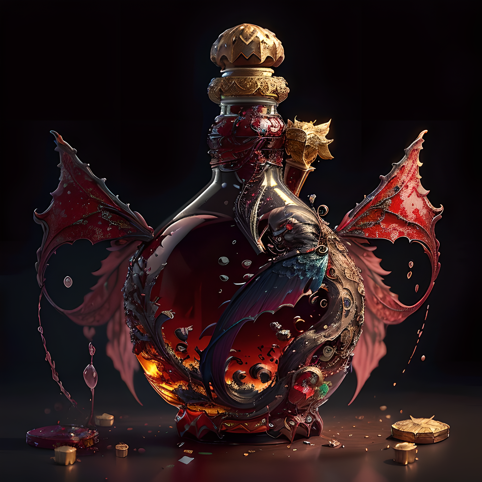 (masterpiece, top quality, best quality, official art, beautiful and aesthetic:1.2),(8k, best quality, masterpiece:1.2),CGbottlesw, no humans, blurry, blurry background, still life, wings, bottle, depth of field, Metal sculptures with glass bottles on them, glass bottles, Metal sculptures, red bottles,<lora:CGbottlesw_20230611232152:1>,