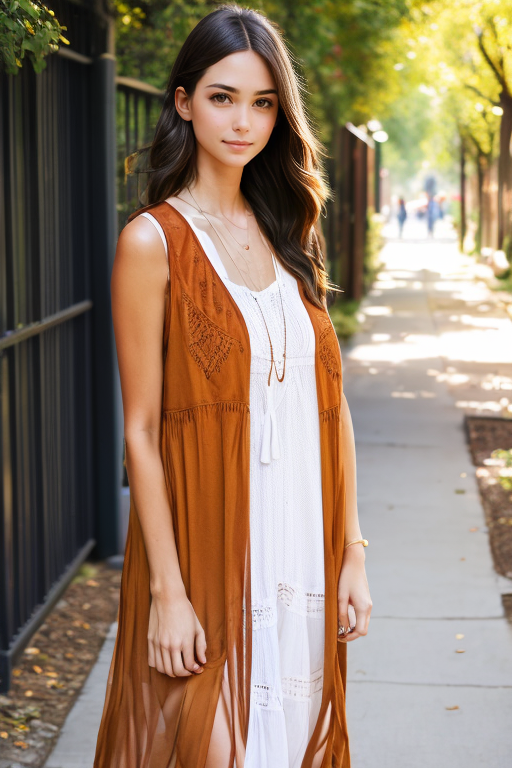 boho vest, long vest, girl, standing, white sundress, huge breasts, front view, dark hair, in park, mid-day time, alley in background, serious face, <lora:Boho vest:0.8>, <lora:weight_slider_v1:-1>