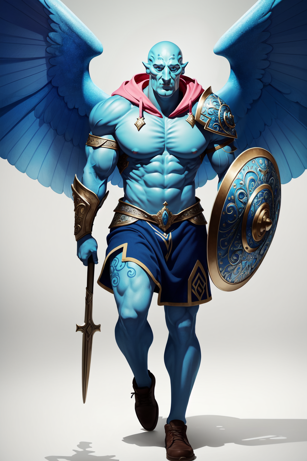 (masterpiece, best quality), intricate details, 1boy, <lora:handsome-squidward:1> Handsome-squidward, (blue skin:1.3), bald,, pink lips, blue, muscular, pecs, <lora:ValkHoodie:0.8> hoodie, [man|walkure], [walkure_armor, viking|hoodie], wings, viking,
