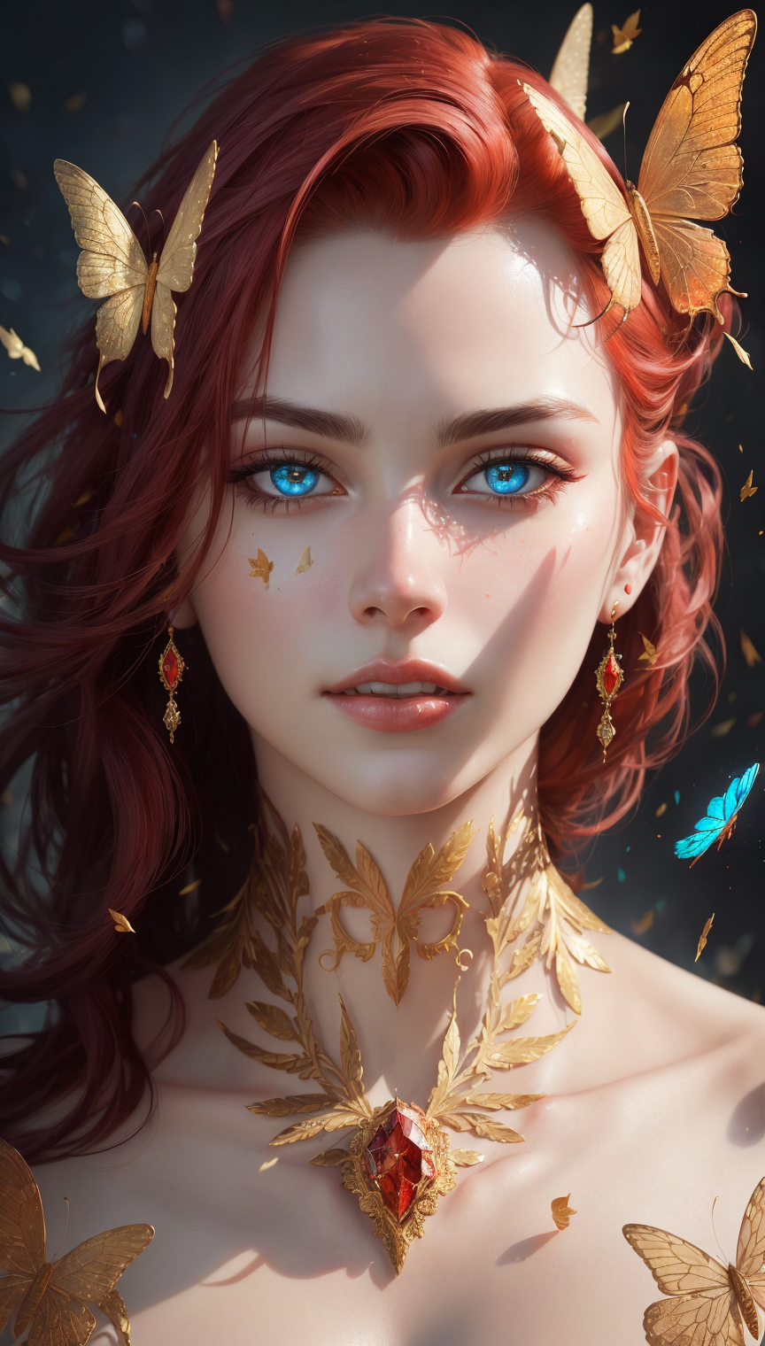 8k photograph of beautiful cyborg with red hair, intricate, elegant, highly detailed, majestic, digital photography, art by artgerm and ruan jia and greg rutkowski surreal painting gold butterfly filigree, broken glass, (masterpiece, sidelighting, finely detailed beautiful eyes: 1.2), hdr,
