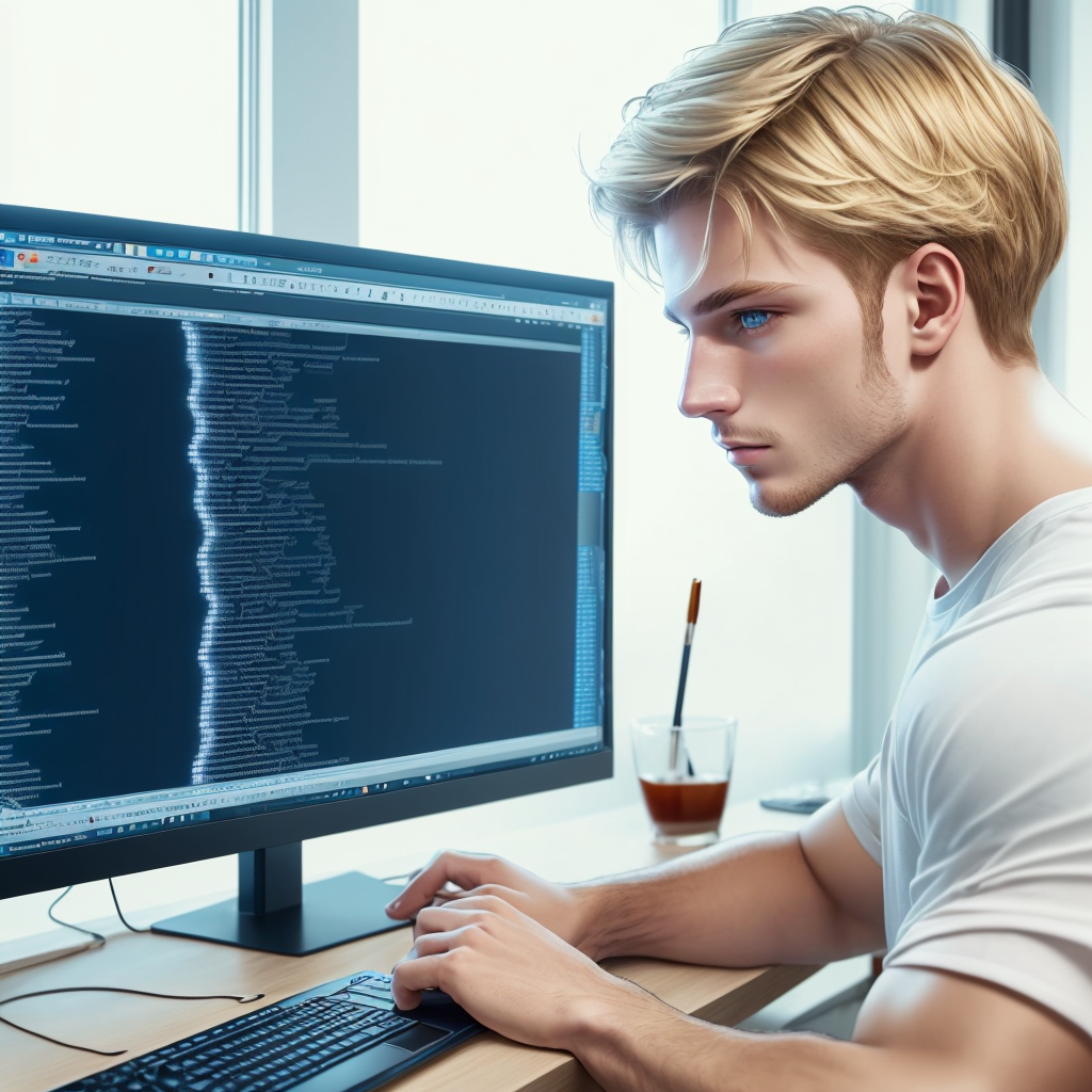 (masterpiece, top quality, best quality, beautiful and aesthetic:1.2), 1guy, blonde hair, blue eyes, is making a website, programming language, javascript, coding, visual studio code, monitor