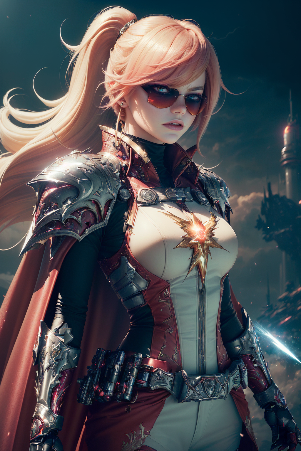 A stunning digital painting of (Emma Stone:1.4),masterpiece, best quality, high detailed, (As Lightning from Final Fantasy XIII, dressed in her white, red, and gold Guardian Corps uniform, complete with a flowing red cape and her signature gunblade. She engages in a fierce battle against formidable foes, her hair flowing in the wind as she strikes with precision and power.:1.5),(in the style of Kekai Kotaki:1.3),(A pair of bold, retro-inspired sunglasses that shield her eyes from the sun while simultaneously adding a touch of glamour to her overall look.:1.6),epic fantasy character art, concept art, fantasy art, a character portrait, fantasy art, vibrant high contrast,trending on ArtStation, dramatic lighting, ambient occlusion, volumetric lighting, emotional, Deviant-art, hyper detailed illustration, 8k, gorgeous lighting, <lora:VampiricTech:0.35>,vamptech ,rifle, android,, wearing excessive makeup,Blush,Mascara,Eyebrow pencil,Eyeshadow,Eyeliner,Lip liner,Lip gloss,(Dramatic lashes:1.3),Cut crease,Ombre lips,Graphic eyeliner,extreme makeup, eye shadow, lipstick, excessive makeup