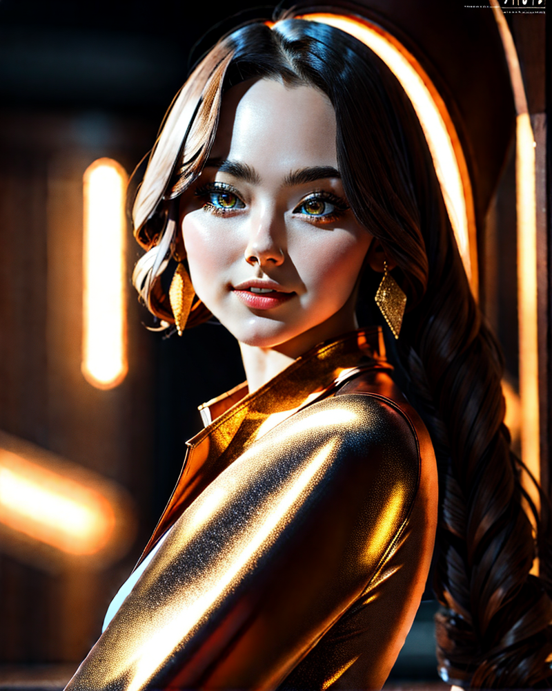 Masterpiece, best quality, uhd, 8k resolution, best light, realistic, detailed background, detailed face, golden eyes, detailed hands, full body, 1girl, elegant girl from atompunk world, <lyco:Kang Mina (Korean Idol):1.0>, portrait