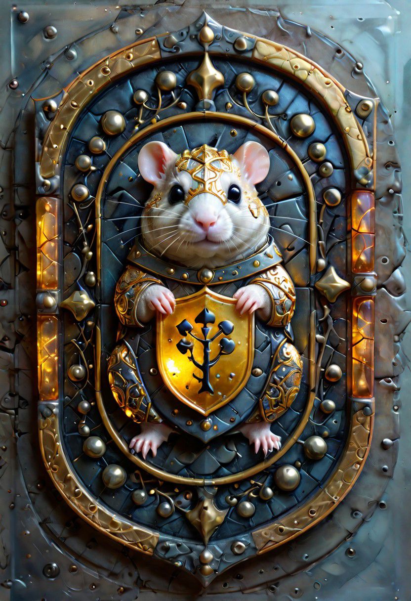 Heraldic coat of arms in the form of a shield depicting a plump Dzungarian hamster in armor, thin translucent tiles, textured gold filigree inserts, ((LED glow inside)), mysterious, magical light, intricate, very detailed, transparent, oracle