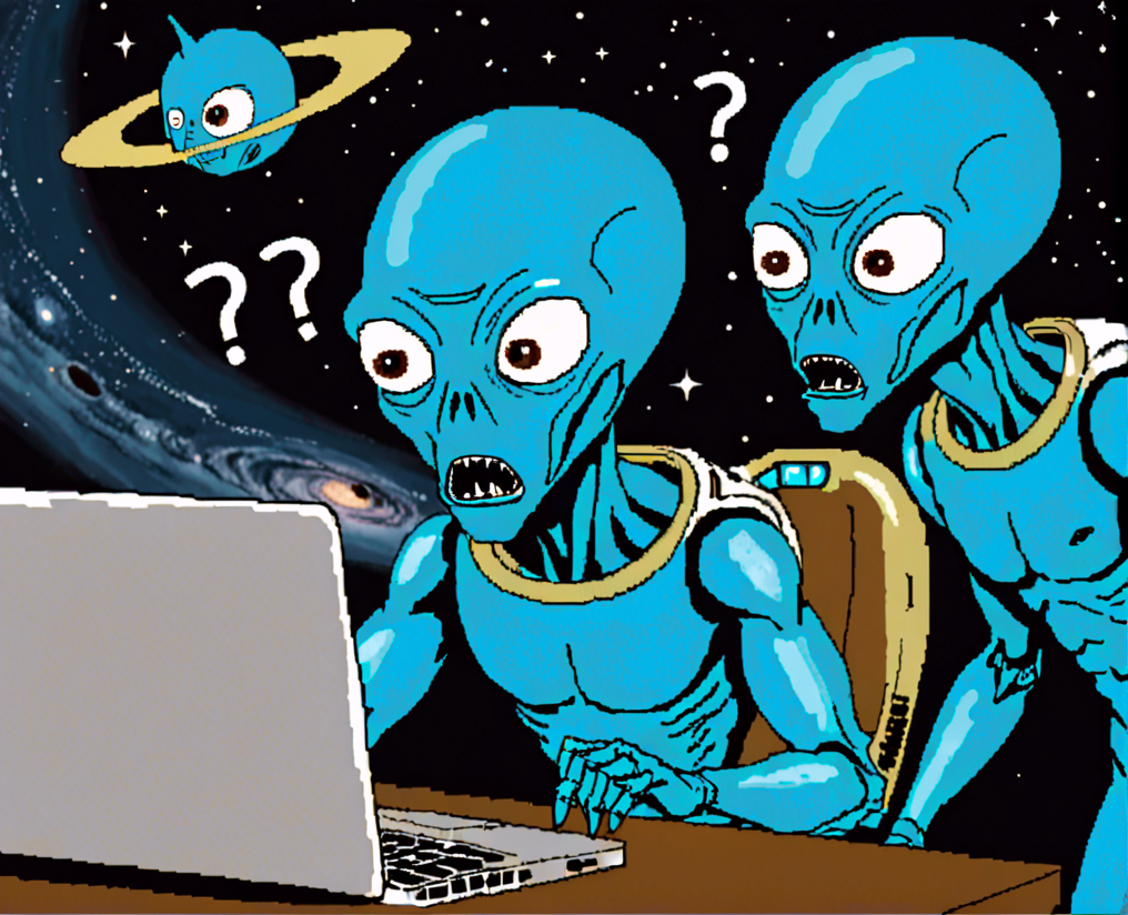 blue Aliens figuring out how to use twitter, confused look, laptop screen with twitter, dilated eyes, spaceship background, open mouth, another coming in to assist, pointing at the screen , ? , <lora:SDXL_MSPaint_Portrait:0.8> MSPaint portrait, MSPaint drawing