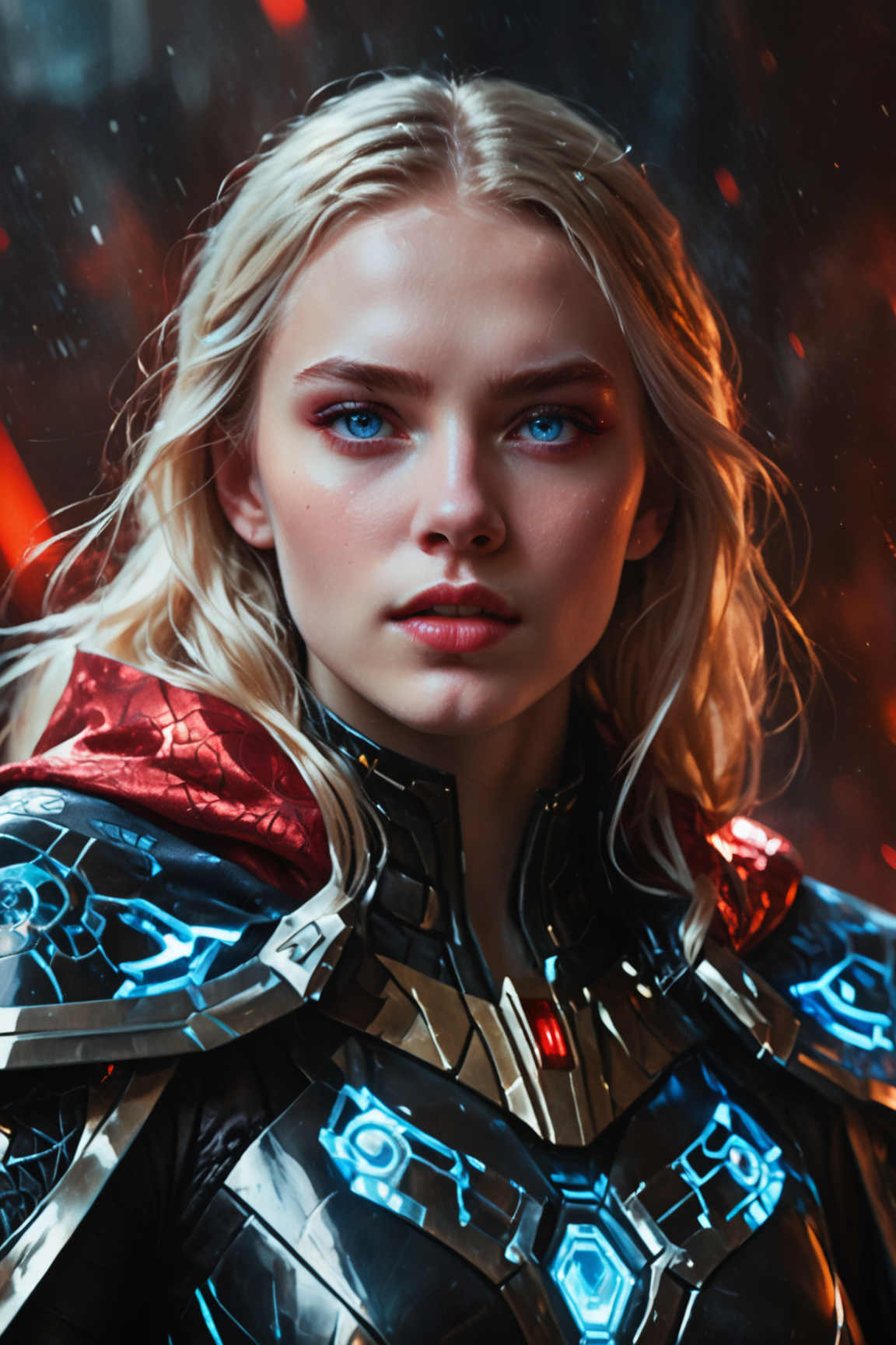 portrait of a highborn female, 18 year old, blonde hair, ice blue eyes, open mouth, futuristic blue transparent cloak with intricate red glowing pattern, dark uniform, masterpiece, shallow depth of field, cinematic lighting, rim light, dark red background, concept art, ((oil painting)), scifi, science fiction, <lora:add-detail-xl:1> <lora:bichu-v0612:0.8> <lora:Concept Art Style SDXL_LoRA_Pony Diffusion V6 XL:1>