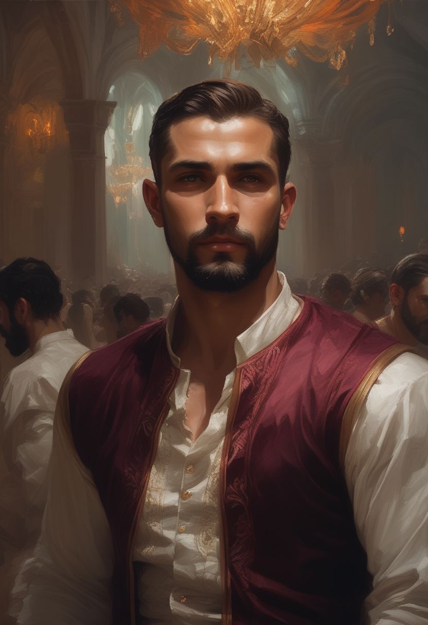extremely detailed masterpiece (by Daniel F Gerhartz|Sam Guay|Maximilian Pirner]. fantasy, high-tech. a 28-year-old Iraqi male aristocrat walking through a populated ballroom. He wears a tight, revealing, ornately-embroidered, burgundy, v-neck shirt; and a simple, plain necklace. His appearance is (muscular:1.9], (extremely-hairy:1.8], manly, and roguish, with massive biceps; a dark very short undercut; an unshaved, perfect, stylish, short, neatly-trimmed beard; and mahogany-toned skin. He personifies mischief, danger, intrigue, and mystery.