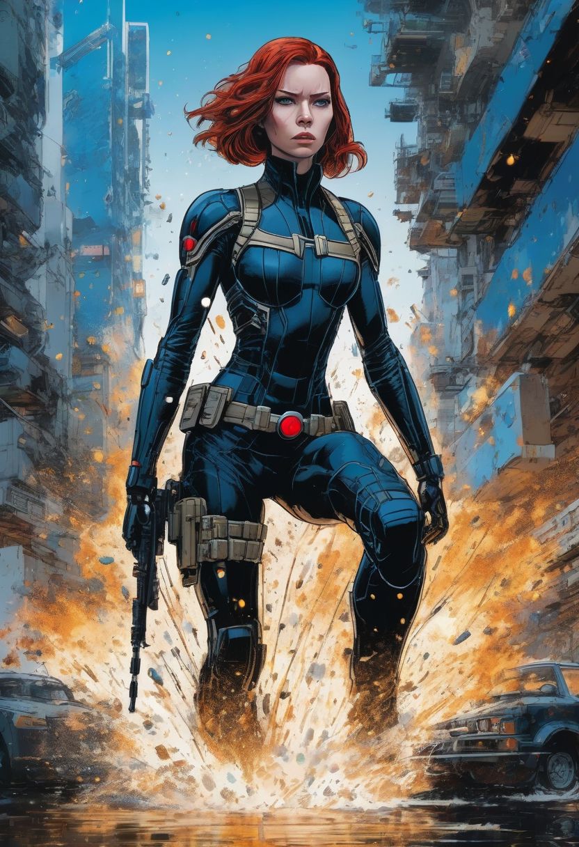 KATSUHIRO OTOMO Style, black widow Marvel, GEOF DARROW Style, YOJI SHINKAWA Style, suona una chitarra elettrica ,Makeup, Explosion Of Liquid Splash, blue, White, Black, Intricate, Highly Detailed, Fantasy Background, Illustration, Sharp Focus, Dramatic Lighting, Trending On Artstation, Cinematic, 8k, Concept Art, Elegant, Reflections