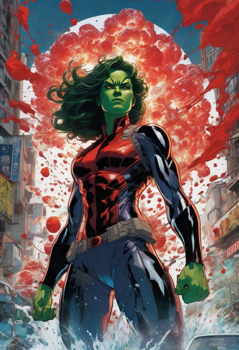 KATSUHIRO OTOMO Style, she-hulk Marvel, GEOF DARROW Style, YOJI SHINKAWA Style, Makeup, Explosion Of Liquid Splash, red, White, Black, Intricate, Highly Detailed, Fantasy Background, Illustration, Sharp Focus, Dramatic Lighting, Trending On Artstation, Cinematic, 8k, Concept Art, Elegant, Reflections