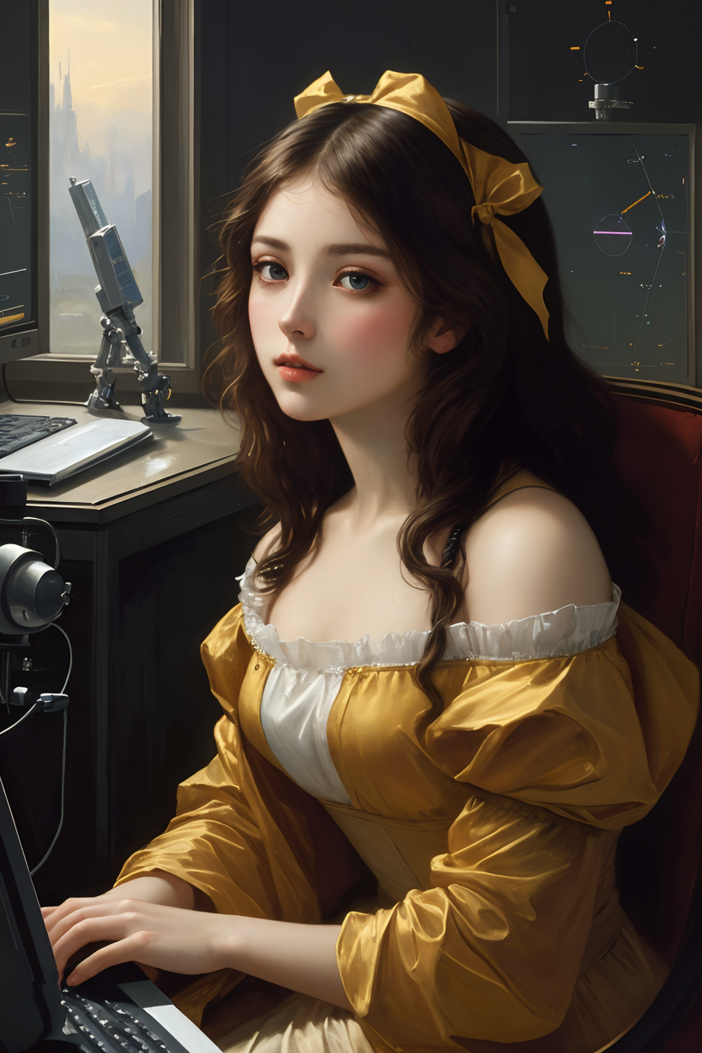 (8k, best quality, masterpiece:1.2),(best quality:1.0), (ultra highres:1.0), a beautiful woman, shoulder, hair ribbons, ((science fiction)), spaceship, computer, art by Alexandre Cabanel, oil painting \(medium\),