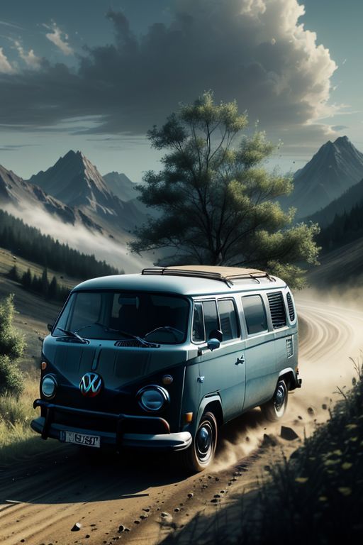 A blue Volkswagen T1 is driving along a dirt road in the mountains, dust is flying from under the wheels, there is a trunk with suitcases on the roof, late evening, the headlights are on