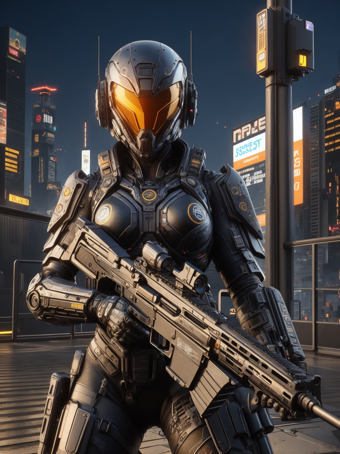 woman in yellow mad-bdyarmr, aiming rifle, night, cyberpunk roof top, neon lights, lying on stomach, <lora:Neon_Cyberpunk_SD1.5_Body_Armor:0.8>, (masterpiece:1.2), best quality, (hyperdetailed, highest detailed:1.2), high resolution textures