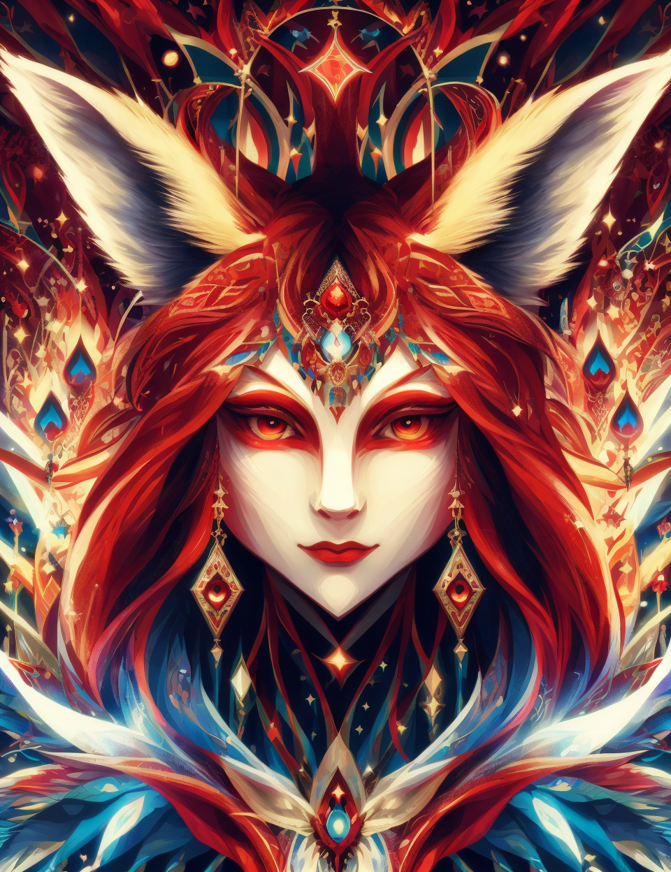 DonM4lph4, quinametzin, human, multiple tails, fox ears,power, magical enchanting aura,supernatural alluring eyes, white and red, intelligence, trickery,wisdom, supernatural feats , <lora:DonM4lph4-000006:0.7>