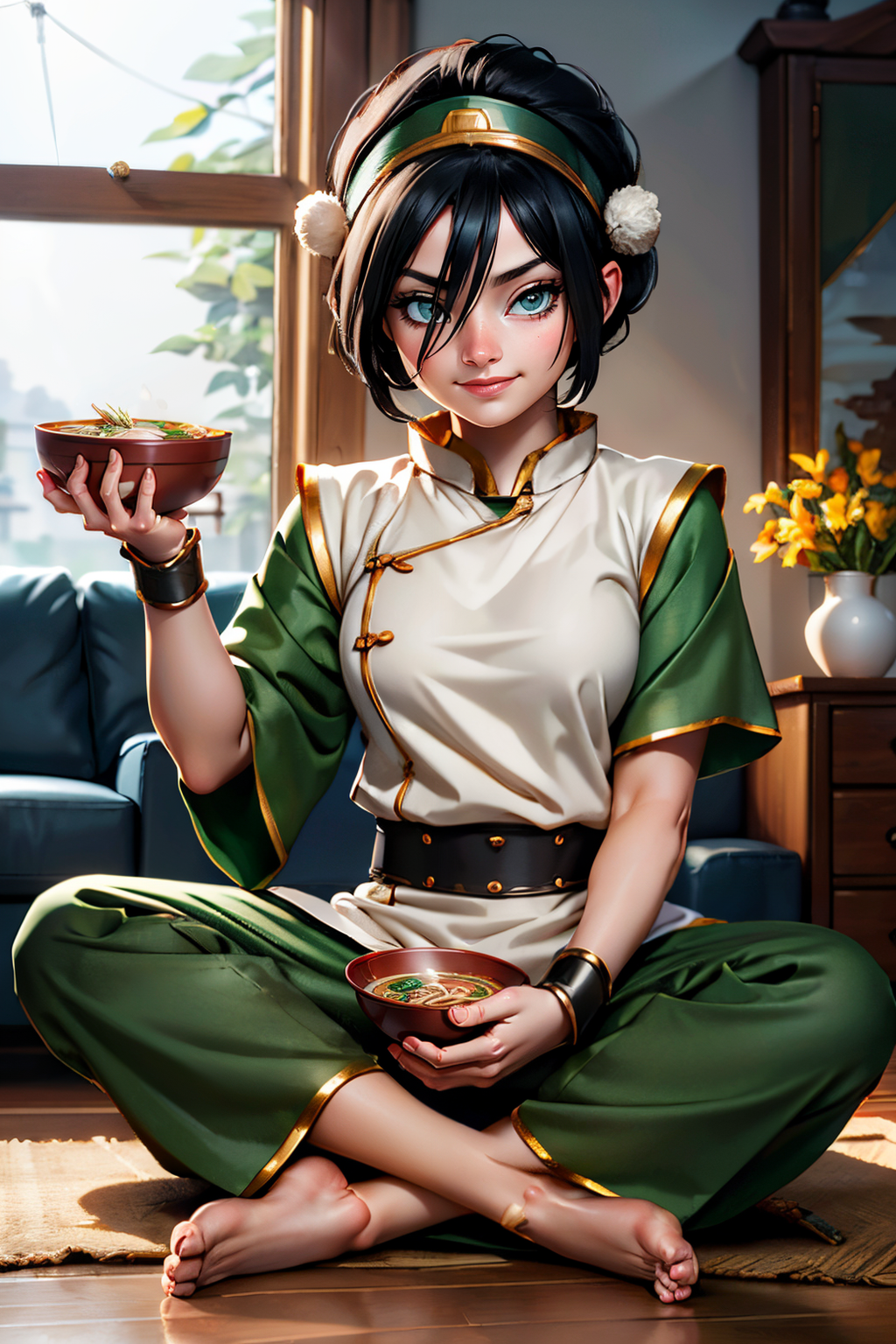 toph bei fong, short black hair, white eyes, headband,hair ornament, blind, green chinese clothes, tunic, bracers, pants, barefoot, serious, smirk, sitting, on floor, holding bowl of soup, ramen, inside living room, soft lighting, high quality, masterpiece, <lora:Toph:.7>