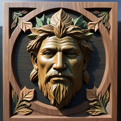 a wood carving artwork on a plaque portraying ((The Green Man)), Celtic mythology, Celtic patterns, Male face surrounded by leaves, King, Beard, Leaf crown, leaves growing out of the face, in shades of brown, Intricately crafted details using the wood, drawing inspiration from wood sculptures, natural wood colours, light oak, <lora:add-detail-xl:0.5>