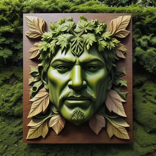 a wood carving artwork on a plaque portraying ((The Green Man)), Celtic mythology, Celtic patterns, Male face surrounded by leaves, leaves growing out of the face, Intricately crafted details using the wood, drawing inspiration from wood sculptures, natural wood colours, light oak, <lora:add-detail-xl:0.5>