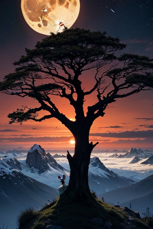 gfsqm, tree, no humans, scenery, mountain,silhouette,branch, tree, bird, no humans, rabbit, rabbit ears, star, full moon, solo,red theme