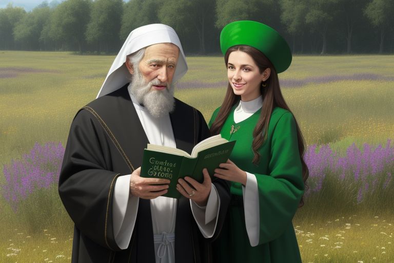 (masterpiece, best quality, high quality, highres), realistic, magic aura, saint patrick, an (old saint with green eyes:1.3) two cute leprechauns (husband and wife) finding a pot filled with large books in a beautiful meadow, with a rainbow in the background. They are very happy and excited.