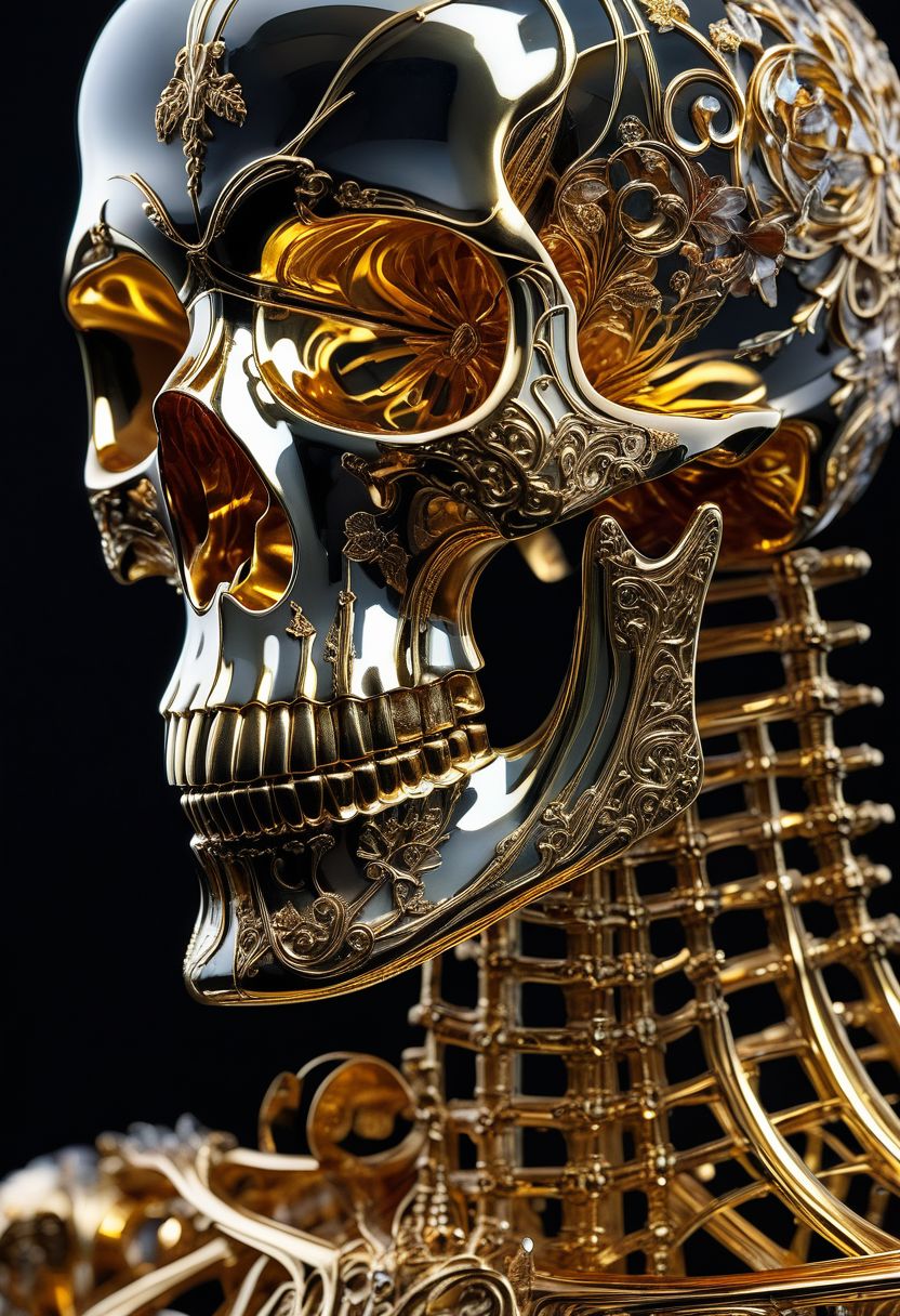 A captivating, hyperrealistic masterpiece showcasing a skeleton-inspired glass artwork, intricately designed to perfection. The mesmerizing transparent piece features a mesmerizing blend of deep matte gold, shiny gilt, shiny silver, and matte copper, revealing the stunning details of its glass construction. The intricate design, layered with countless small details and grandiosity, creates an awe-inspiring visual experience that is both unique and enchanting. This conceptual work, inspired by Vogi's idea and prompt, stands as a testament to the artist's innovative vision and exceptional craftsmanship.