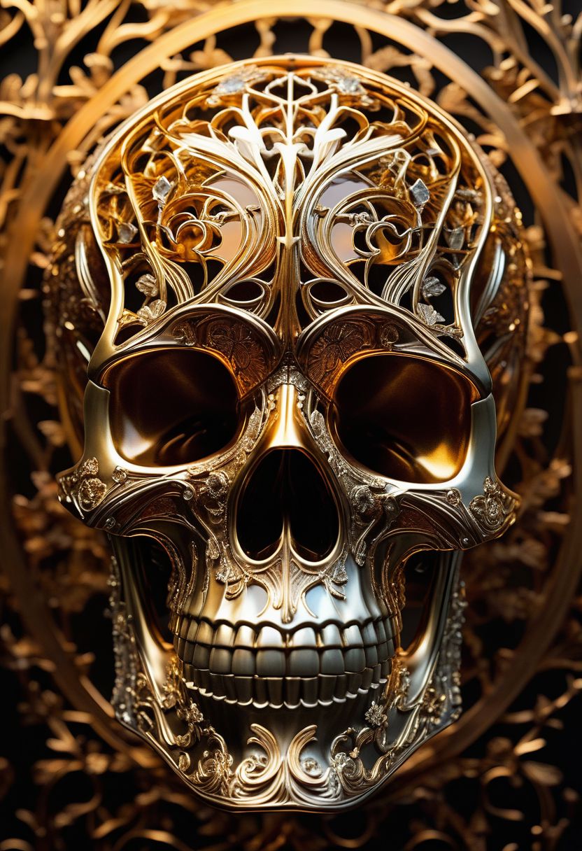 A captivating, hyperrealistic masterpiece showcasing a skeleton-inspired glass artwork, intricately designed to perfection. The mesmerizing transparent piece features a mesmerizing blend of deep matte gold, shiny gilt, shiny silver, and matte copper, revealing the stunning details of its glass construction. The intricate design, layered with countless small details and grandiosity, creates an awe-inspiring visual experience that is both unique and enchanting. This conceptual work, inspired by Vogi's idea and prompt, stands as a testament to the artist's innovative vision and exceptional craftsmanship.