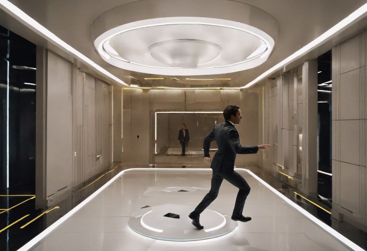 During a thrilling chase or escape sequence, the protagonist utilizes an anti-gravity device, flipping their surroundings. They maneuver through an environment where walls become floors and ceilings become open spaces, creating a dynamic and visually stunning sequence.