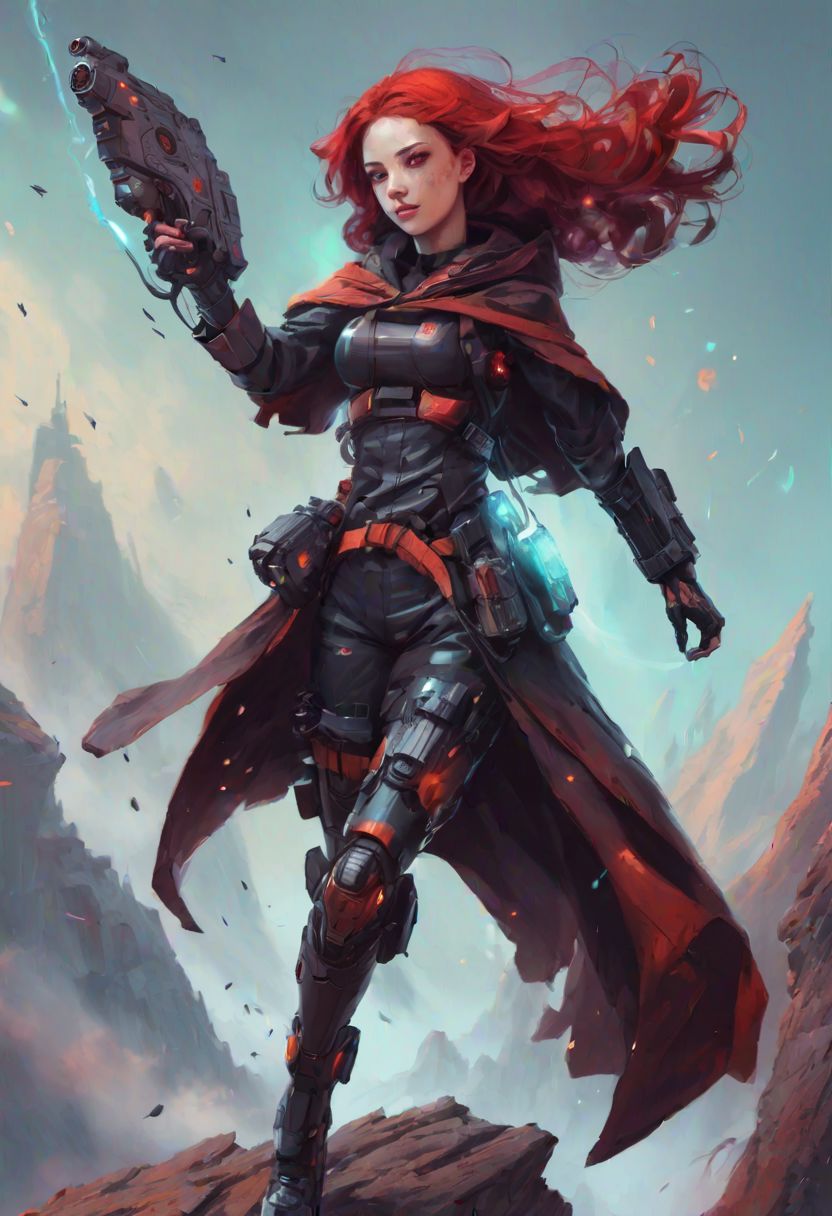 A beautiful cybernetic girl with red hair is leap from high rock to the ground. He wears a smoky cloak on his back. She carries a large technological weapon in her hand. The world of spooky colors,