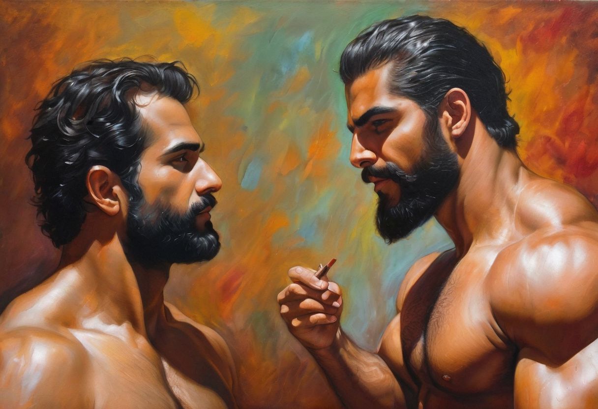 an extremely detailed oil painting by Jay Anacleto of a passionate romantic encounter between two 25-year-old iranian men. they are gazing lovingly at one another. they have shaved heads. they are muscular, brawny, physically fit, with defined abs. they are devastatingly handsome, with distinct facial structures. one man is significantly taller than the other. their skin is dark brown. they have copious body hair. they both have a short beard. they wear no shirts. a colorful dynamic romantic emotional background. a masterpiece.