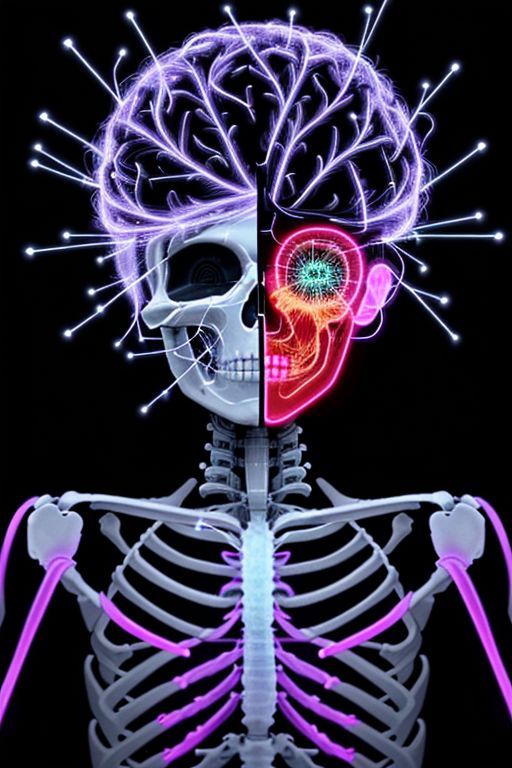 Ai half human half fiber optics see through but neon color flows through fiber optics, brain is picofibers glowing fibers in brain, body is same, shows high detail of moving parts almost see through, be creative and mostly see through showing high detail of skeleton and fiber optics, very detailed eyes you get lost in, awesome
