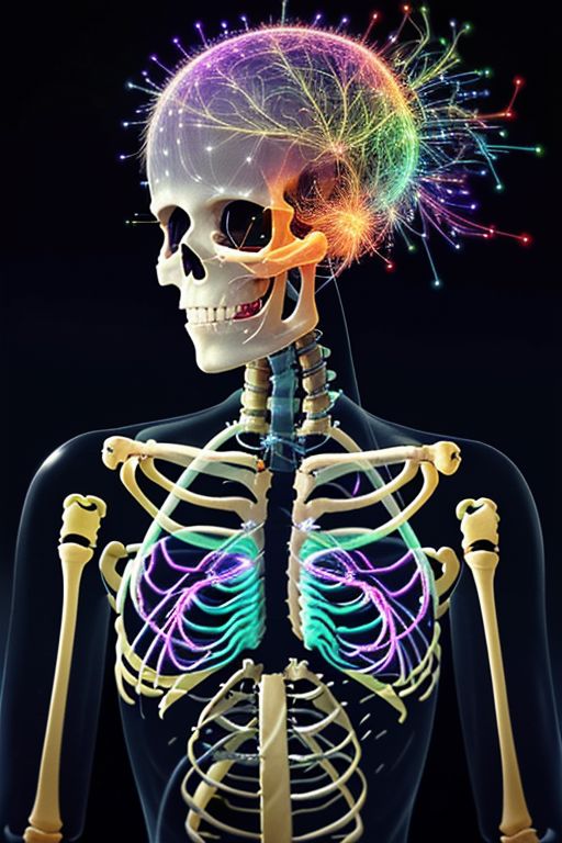 Ai half human half fiber optics see through but neon color flows through fiber optics, brain is picofibers glowing fibers in brain, body is same, shows high detail of moving parts almost see through, be creative and mostly see through showing high detail of skeleton and fiber optics, very detailed eyes you get lost in, awesome