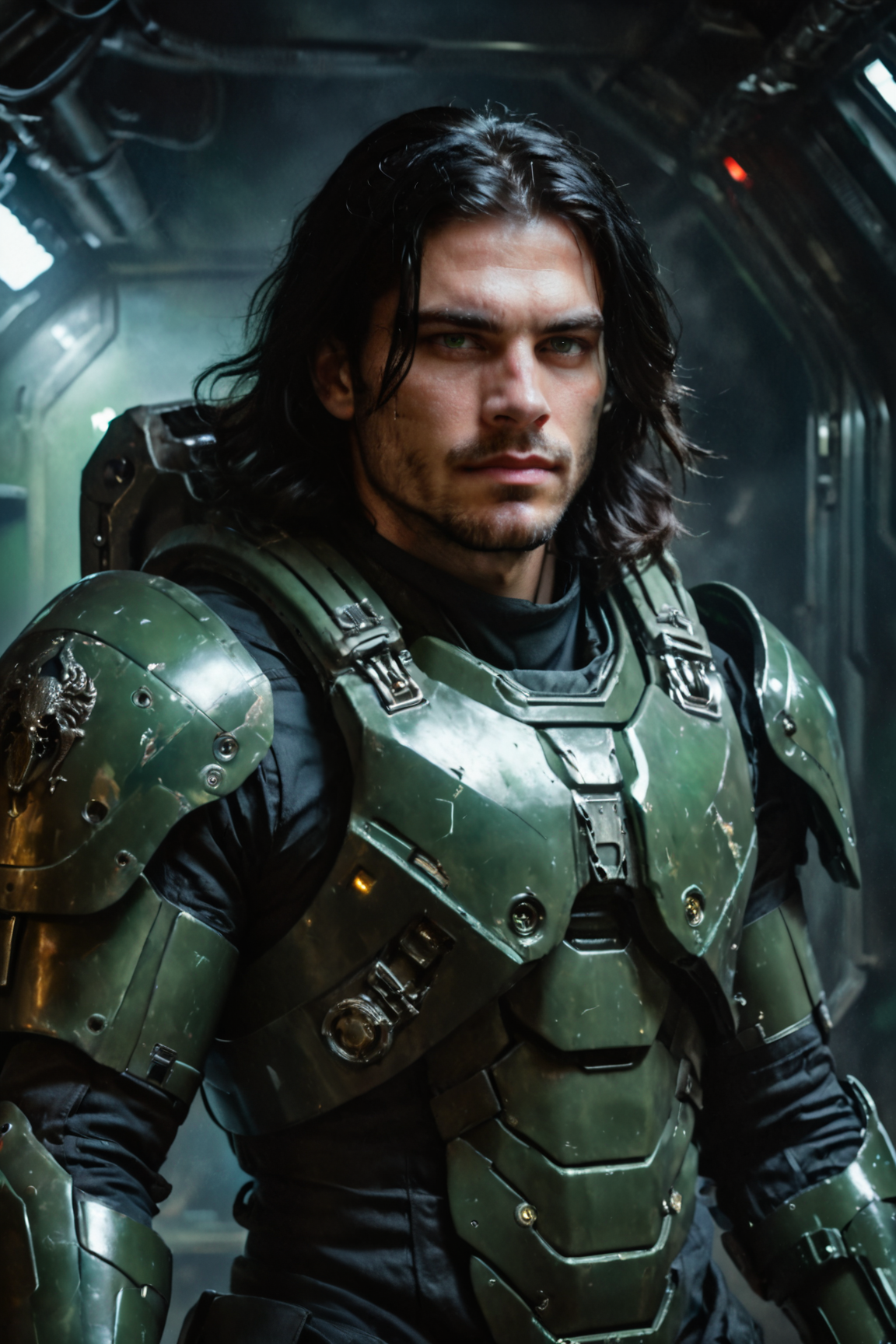portrait of a soldier, male, 30 year old, long black hair, green eyes, in dark armored space suit, holding helmet in arm, grim, masterpiece, shallow depth of field, cinematic lighting, rim light, dark blue background, concept art, ((oil painting)), scifi, science fiction, <lora:add-detail-xl:1> <lora:bichu-v0612:1> <lora:Concept Art Style SDXL_LoRA_Pony Diffusion V6 XL:1>