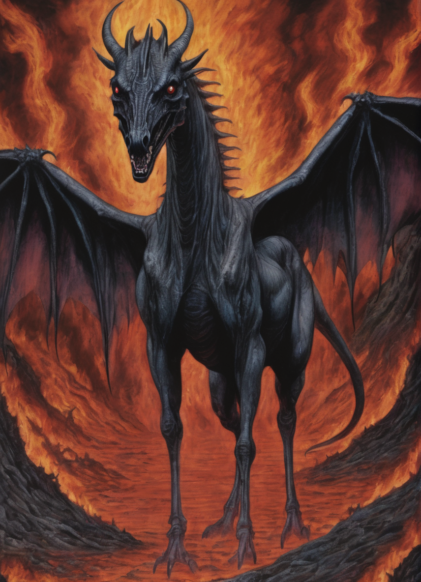 fantasy painting of (thestral) in the fourth layer of hell,garden of eternal hellfire by junji ito,portrait