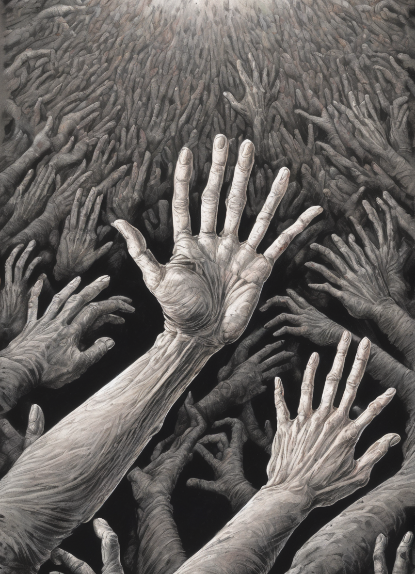 fantasy painting of (human hands) in Timeless Hellscape by Junji Ito,focus hands