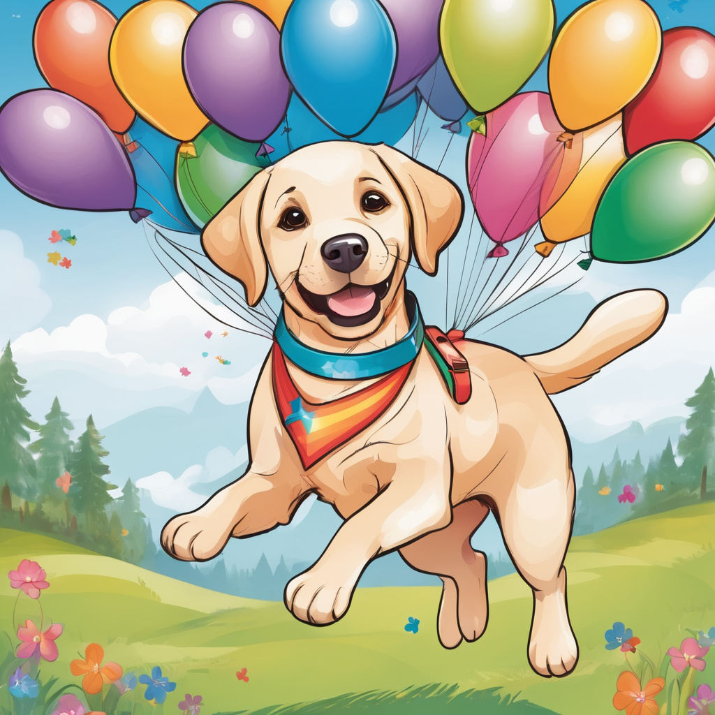 (centered), A small Labrador dog flying with colorful balloons, illustration for kids, child book, cute, gracious.