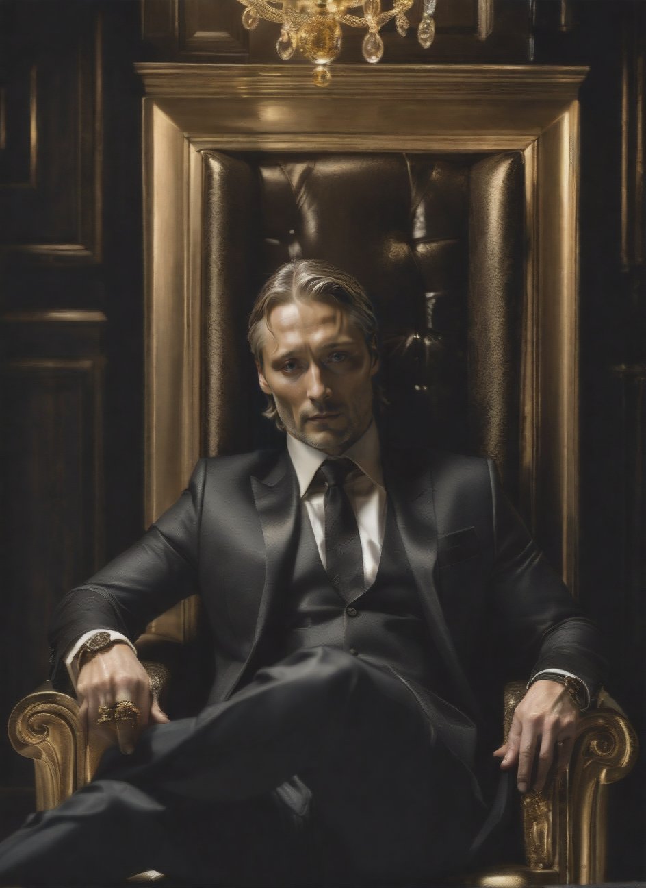 pale Mads Mikkelsen as Hannibal in a black designer suit commands , coffin, guy laying down, black tuxedo, gold chains around, Dark theme, vignette style focus, Spotlight on coffin, inside of dark kitchen,