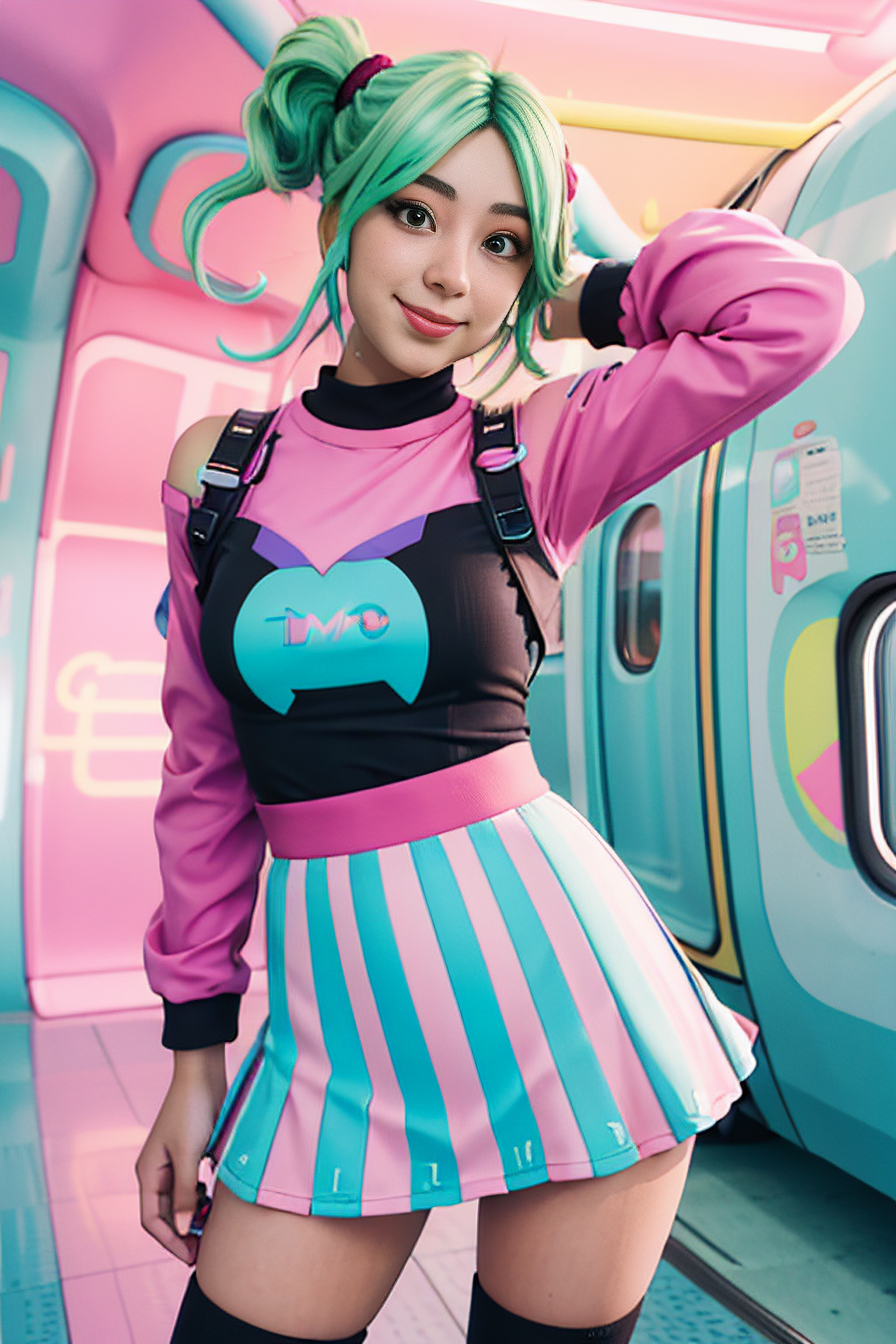 cotton candy twintails, california girl Zoey <lora:Zoey:0.4>, eyes looking viewer, extremely luminous bright design, extremely pastel colors, (frutiger metro background:1.5), pastel colors, upbeat, smile, candy covered short skirt, miniskirt, long shirt, full striped black bodysuit, full body
