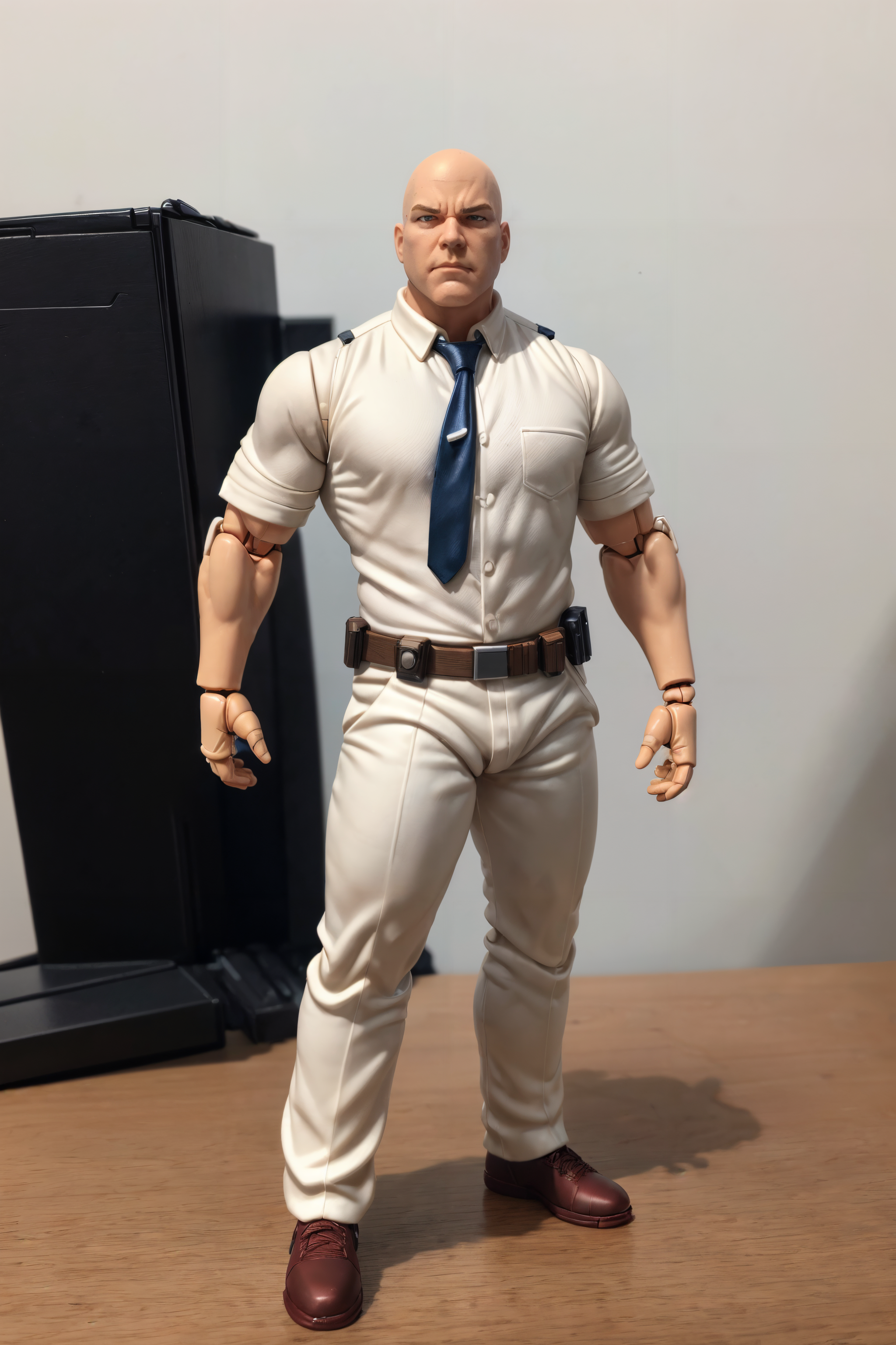 (ActionFigureQuiron style), solo, Dirk Blocker, bald, action figure, concept art, ActionFigureQuiron style, action figure, plastic toy, premium toy, <lora:quiron_ActionFigure_v2_lora:1.1>, <lora:add_detail:0.8>, (macro shot:1.2), indoors, office, (bokeh:1.2)