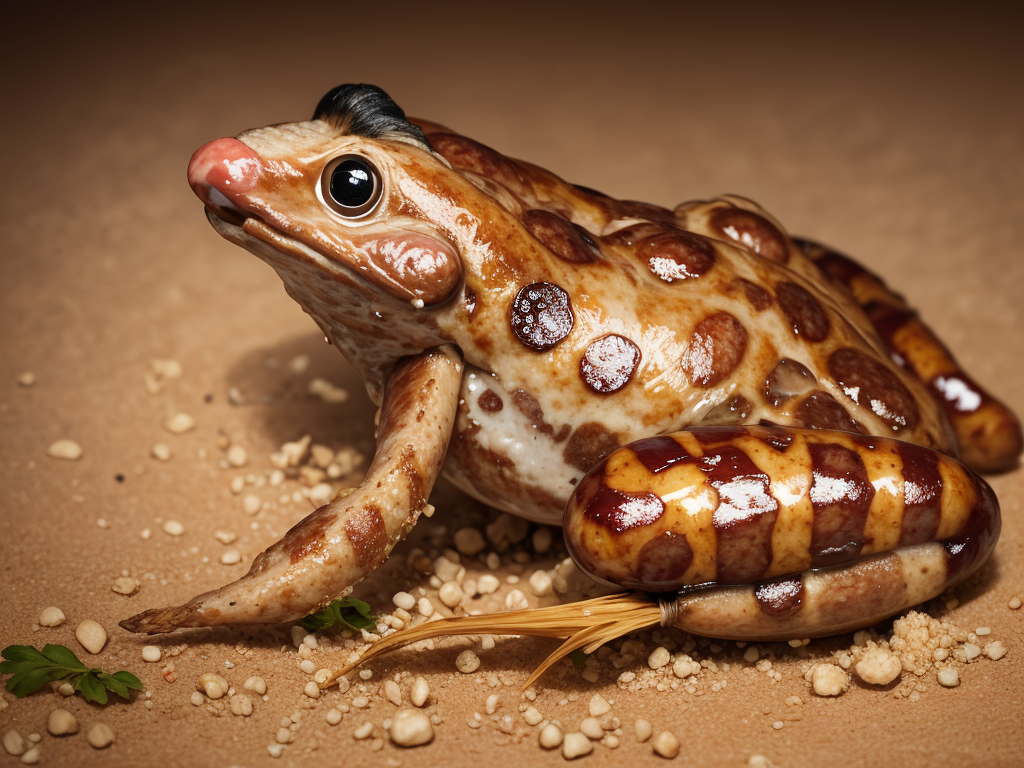 high quality, best quality, highres, absurdres, (a photo of sausage:1.3), (frog:0.5),