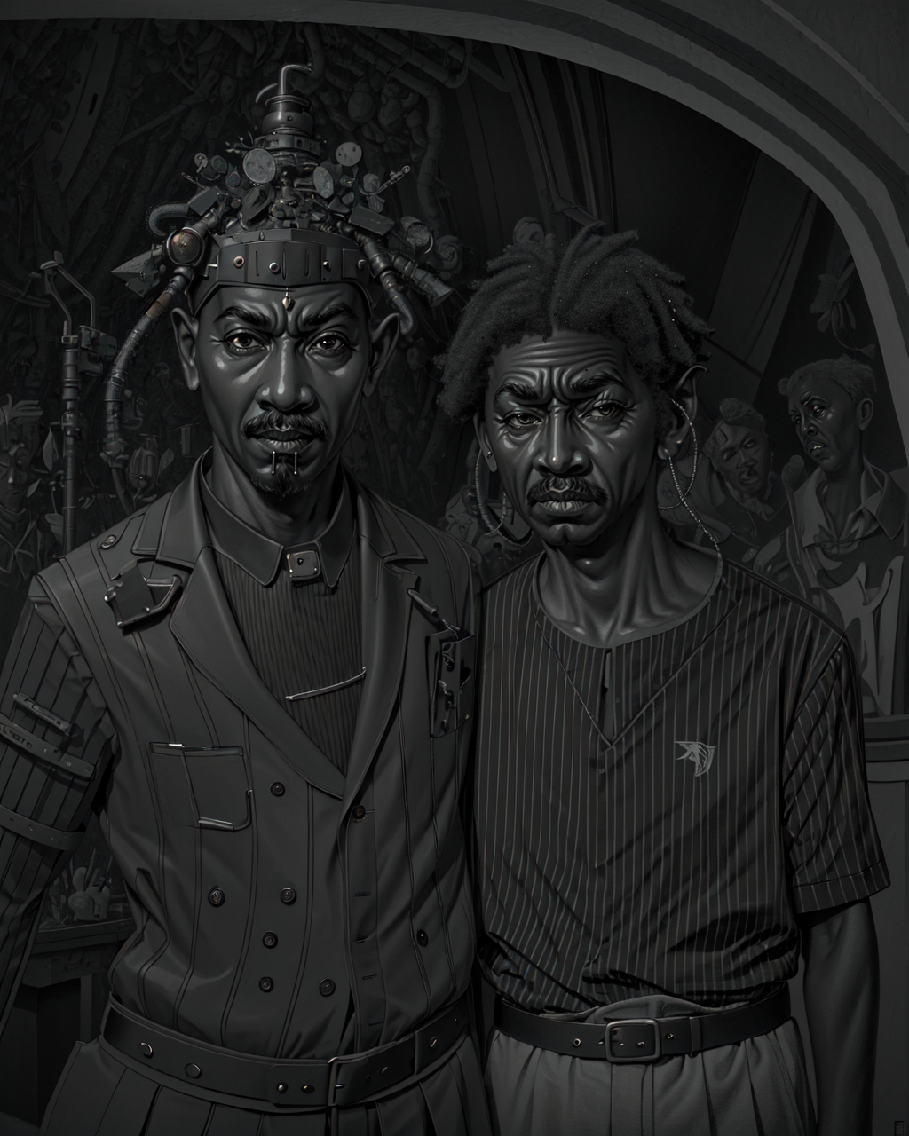 (mature old ethiopian:1.3) man, (skindentation:1.3), (detailed wrinkled face), (skinny:1.1), red eyes, gray hair, taper fade, cybernetic street performers, robotic musicians, augmented street dancers, interactive performances, (monochrome:1.3),very intricate,(rough painting),engraving,high res,<lora:SylvanorStyle:1.3>