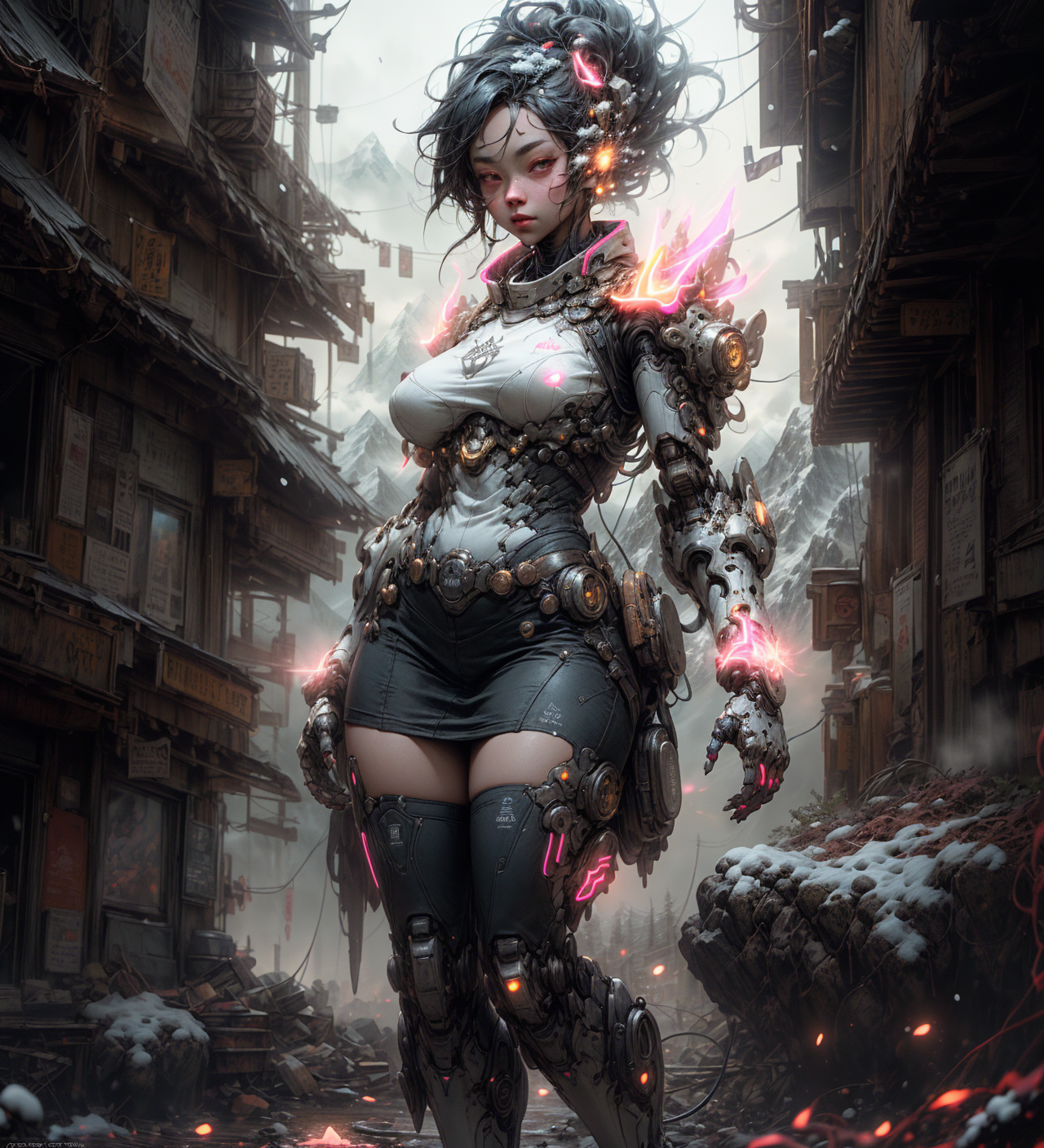 (Magical Digital Artwork:1.3) of (Sketched:1.3), (full body:1.3) cute girl slim robot, (neon big breasts:1.3), stockings, skirt, scorched earth, dropping snow, light engrave in intricate details), fog, mountains,(by Artist Ross Tran:1.1),(by Artist Greg Rutkowski:1),CGSociety,ArtStation,(Magical Realism:1.15),(CGI Art:0.9),(Realism:0.85),(Offset print:0.75),close portrait,(manga:1.3), (depth field:1.3) ,beautiful,attractive,handsome,trending on ArtStation,DeviantArt contest winner,CGSociety,ultrafine,detailed,studio lighting <lora:Mecha:1.1>, <lora:more_details:0.4>, boom