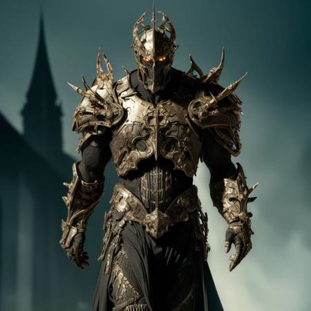 (dark_lighting:1.3), a malevolent spirit knight, wearing an intricate bone-patterned armor, Skeletal body, (intricate_details:1.22), (bone_armor:1.3), cinematic composition, menacing, eerie atmosphere, (Dark Lights:1.4), (dense_fog:1.2),(rim_lighting:1.3), color_grading, looking at viewer, (full body:1.2), death_church, (evil_presence:1.2),( dark fantasy style:1.3), (cinematic lighting:1.2), (Mystery:1.3), masterpiece, best quality, ultra detailed, hires, 8K, extremely detailed CG unity 8k wallpaper, intricate, highly detailed, realistic, (by marek okon:1.3), <lora:mechStyle_mechv10:0.3> <lora:sxzDeathKnights_sxzWowDK:0.3> wowdk, <lora:moonlord:0.4> a man in black and gold armor, headpiece,