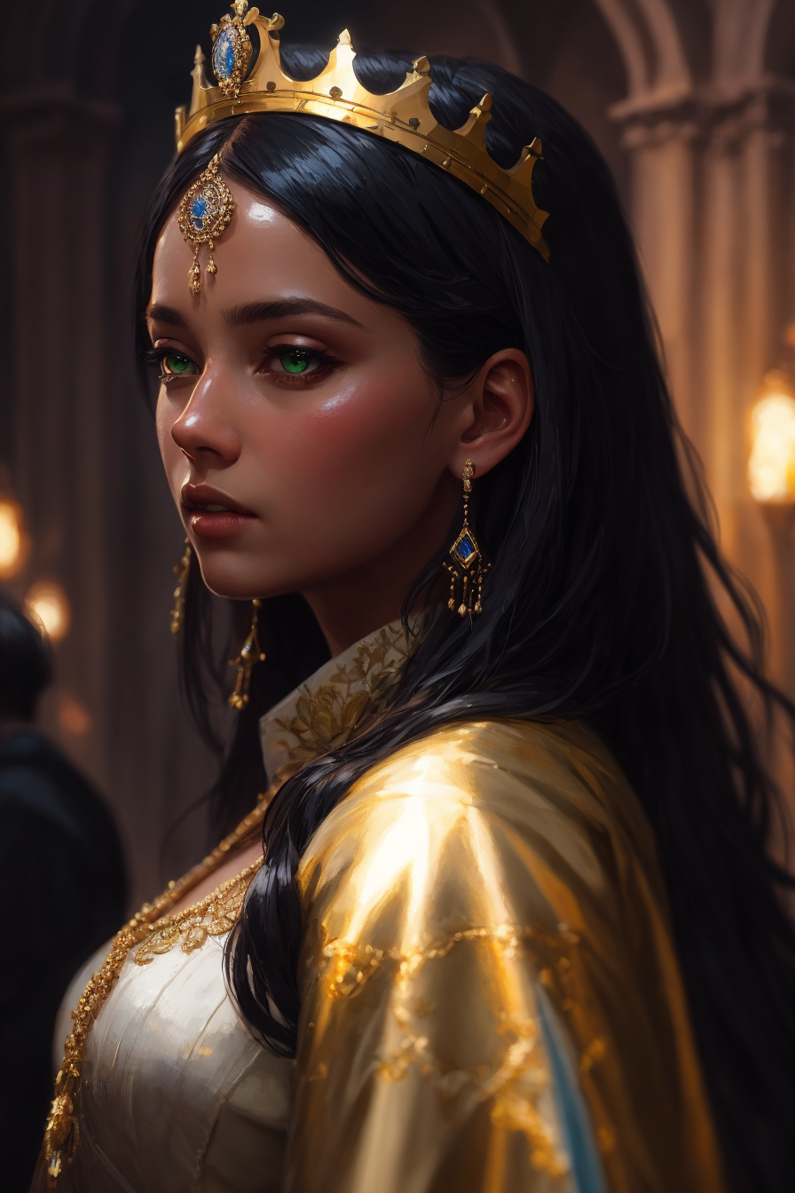 modelshoot style, (extremely detailed CG unity 8k wallpaper), full shot body photo of the most beautiful artwork in the world, medieval queen, green vale, dark skin, black woman, golden crown, diamonds, medieval architecture, professional majestic oil painting by Ed Blinkey, Atey Ghailan, Studio Ghibli, by Jeremy Mann, Greg Manchess, Antonio Moro, trending on ArtStation, trending on CGSociety, Intricate, High Detail, Sharp focus, dramatic, photorealistic painting art by midjourney and greg rutkowski